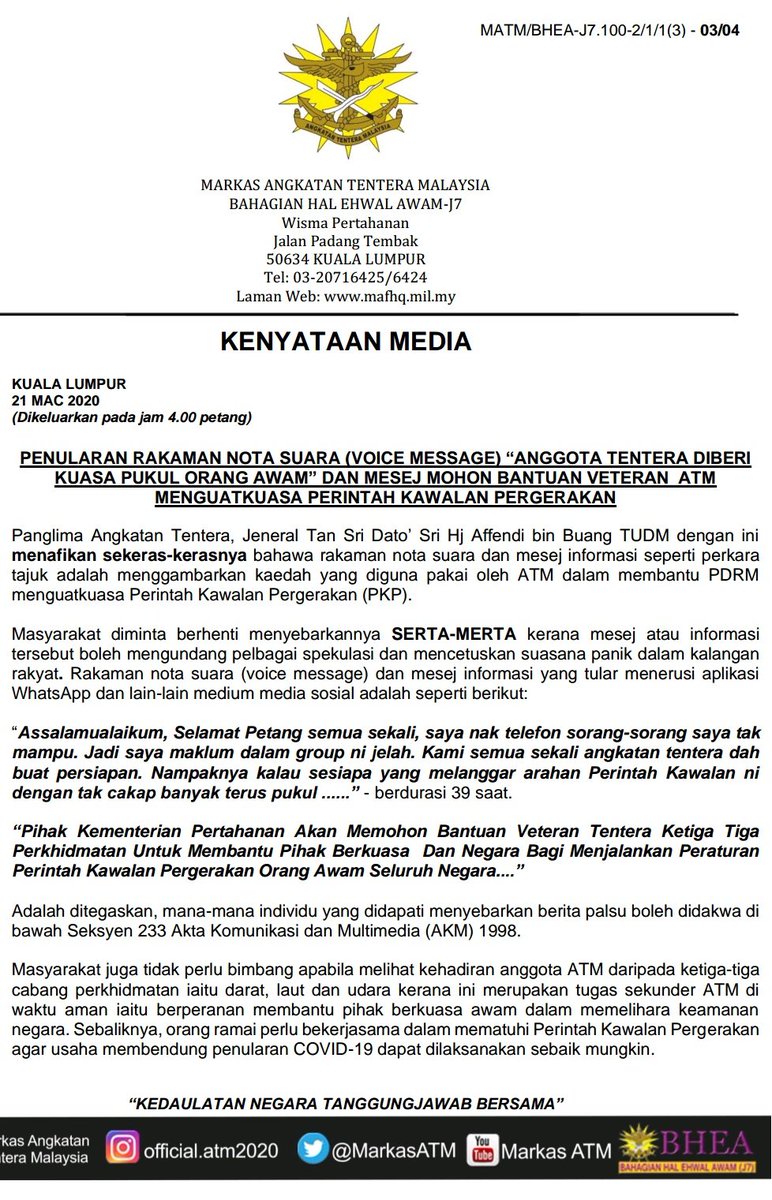 Bfm News On Twitter The Malaysian Armed Forces Has Dismissed A Voice Clip Claiming Military Personnel Are Permitted To Use Physical Force To Enforce The Movement Control Order It Says The Deployment