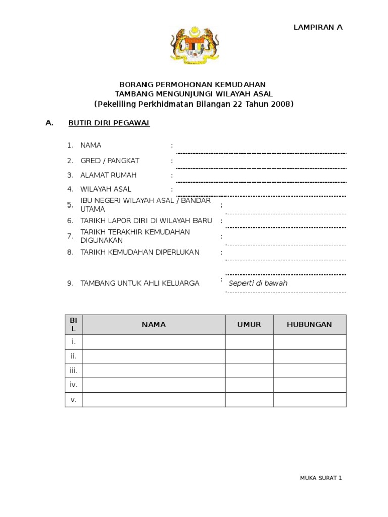 Isteri suami anak dari ibu negeri wilayah asal bandar utama untuk. Permohonan pegawai sila tanda di ruangan yang berkaitan saya memohon menggunakan kemudahan tambang mengunjungi wilayah asal untuk. Diri dan isteri suami anak ke ibu negeri wilayah asal bandar utama iii. Lampiran 1a borang permohonan tambang percuma mengunjungi wilayah asal mengikut pekeliling perkhidmatan bil.