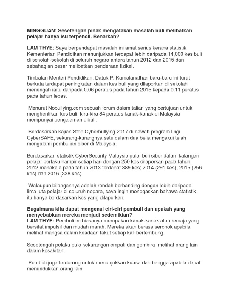 Statistik buli siber di malaysia. Pada 2018 malaysia berada di kedudukan yang keenam dari 28 negara yang mencatatkan kes buli siber terbanyak di seluruh dunia. Sebanyak 9 686 kes membabitkan nilai lebih rm400 juta direkodkan oleh jabatan siasatan jenayah komersial jsjk polis diraja malaysia pdrm sepanjang januari hingga 31 oktober lalu berkaitan penipuan siber dan multimedia. Kita telah menyaksikan bagaimana buli siber telah meragut nyawa beberapa mangsa buli yang akhirnya bertindak membunuh diri sama ada di dalam atau luar negara. 1 kajian tinjauan.