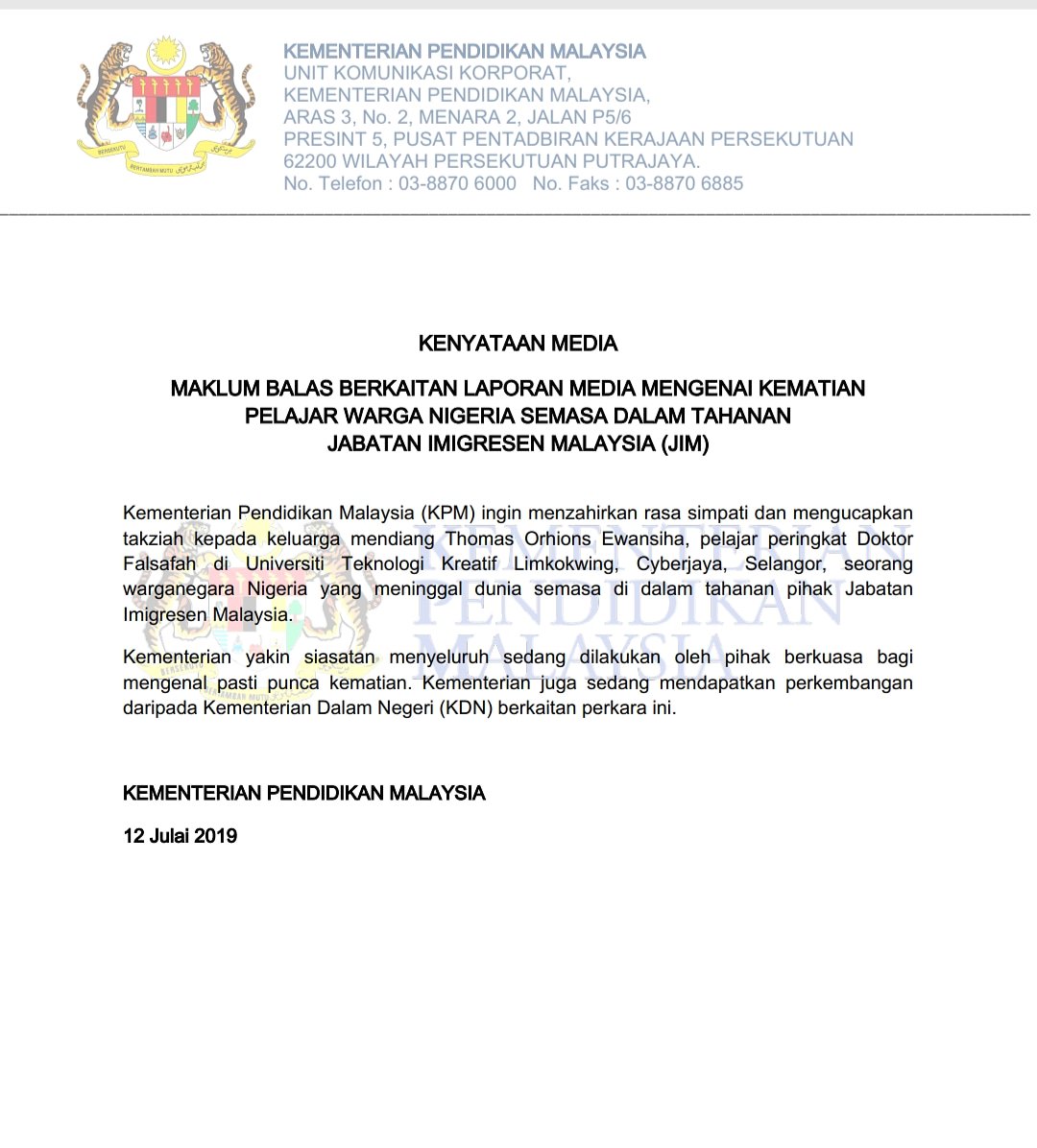 Kpm Twitterren Kenyataan Media Rasmi Kpm Berkaitan Seorang Pelajar Peringkat Doktor Falsafah Di Universiti Teknologi Kreatif Limkokwing Cyberjaya Warganegara Nigeria Meninggal Dunia Semasa Di Dalam Tahanan Pihak Jabatan Imigresen Malaysia