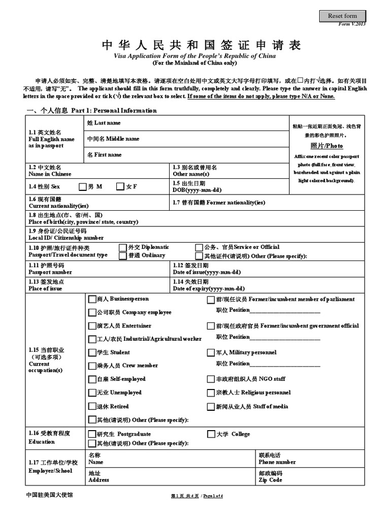 275850 Form V 2013 Visa Application Form Of The Peoples Republic Of China For The Mainland Of China Only The Applicant Should Fill In This Form Course Hero